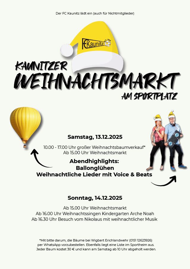 Weihnachtsmarkt 31. 10. 2025 Weihnachtsbäume bitte bei Wigbert Erichlandwehr (0151 12623926) perWhatsApp vorzubestellen. Ebenfalls liegt eine Liste im Sportheim aus.Jeder Baum kostet 30 € und kann am Samstag ab 10 Uhr abgeholt werden.